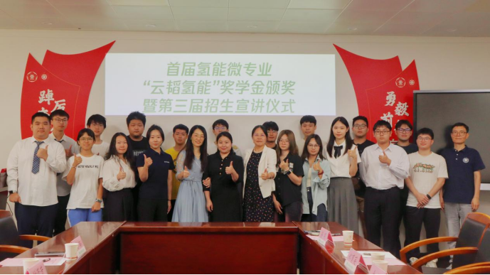 在工学四号馆202会议室成功举办了首届氢能微专业“云韬氢能”奖学金颁发仪式暨第三届招生宣讲活动,广东云韬氢能科技有限公司副总裁钟蕾芳、技术与创新部总监安璐,我校副校长余林、学院副院长郑育英、钟远红等校企领导及首届氢能微专业学生代表出席了本次活动。