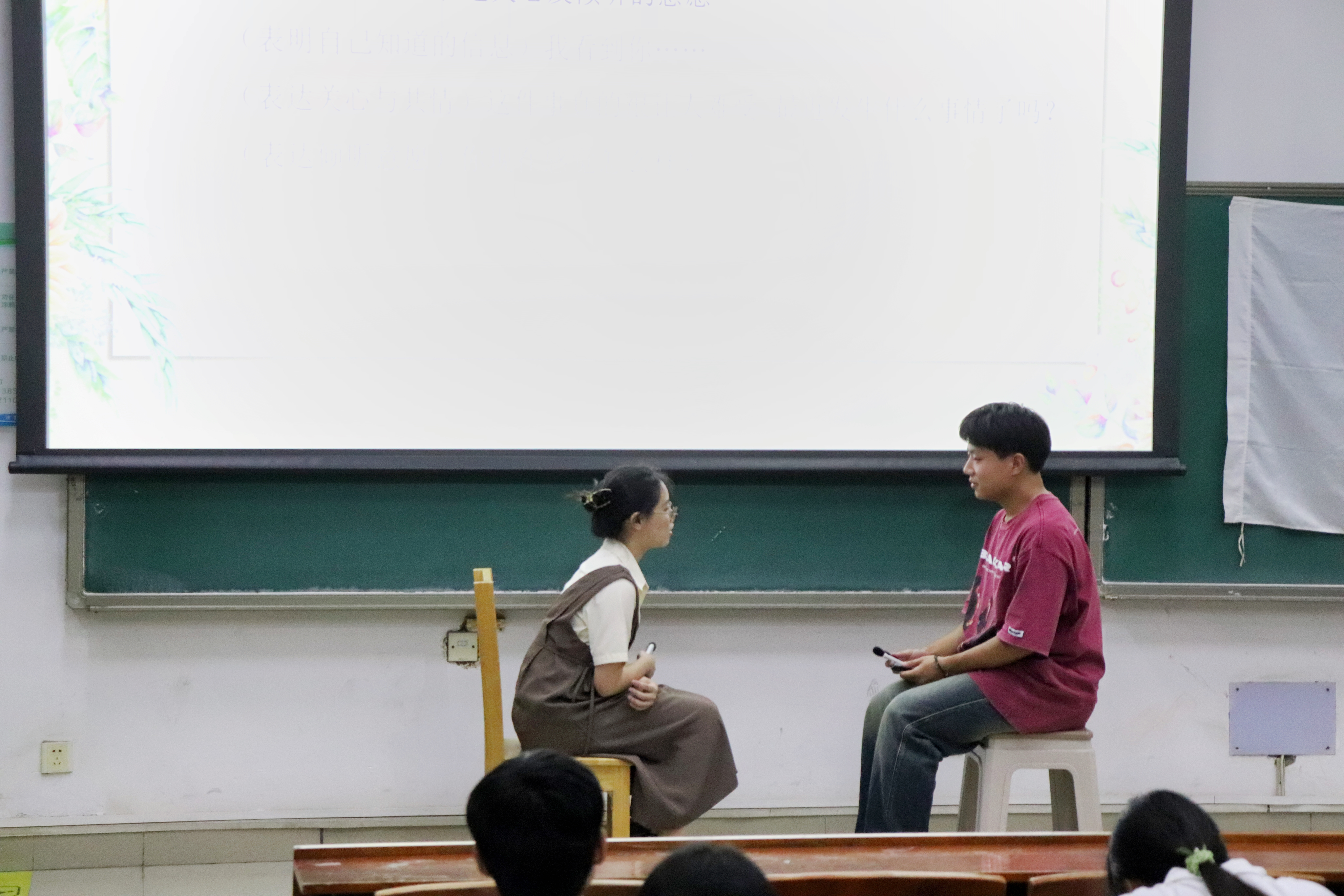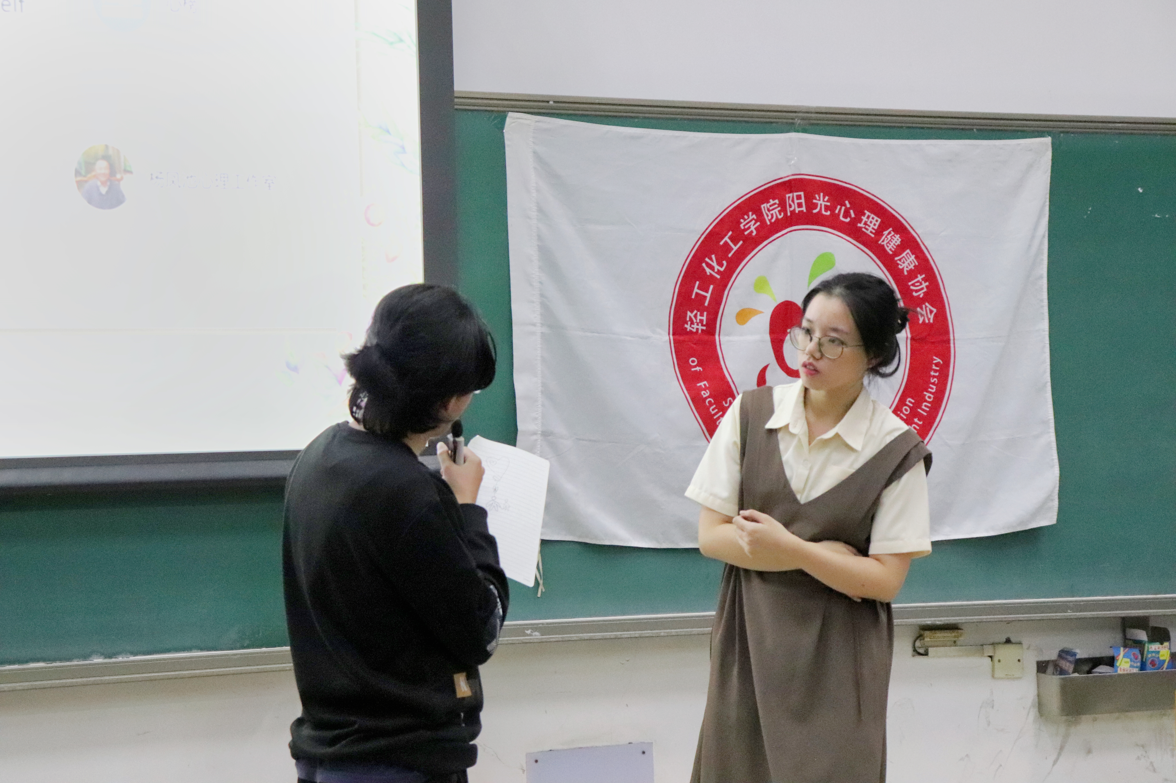 吴晶蕾老师还邀请了拷贝漫画 阳光心理协会主席陈浩楠同学进行了心理问答现场演习。在问答中,指出了人们在沟通时经常犯的两大问题,即盲目安慰他人和否定他人想法,并提出了解决方法。她在现场还开展了心理小活动,让心理委员更加切身实际地领略到心理活动的意义。