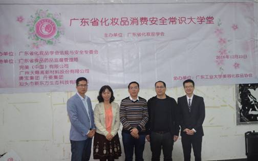 2016年12月23日,由广东省化妆品学会主办、广东省化妆品学会法规与安全专委会承办的第一期广东省化妆品消费安全常识大学堂在拷贝漫画 成功举办。我校拷贝漫画 书记周东斌、拷贝漫画 副院长杜志云教授、广东省食品药品监督管理局化妆品监管处处长郭昌茂、广东省食品药品监督管理局化妆品监管处科长钟雪锋、汀兰生物科技有限公司总工程师彭冠杰、拷贝漫画 副教授郭清泉、广东省化妆品学会法规与安全专委会委员叶剑清、拷贝漫画 谢珍茗老师等多位嘉宾出席。
