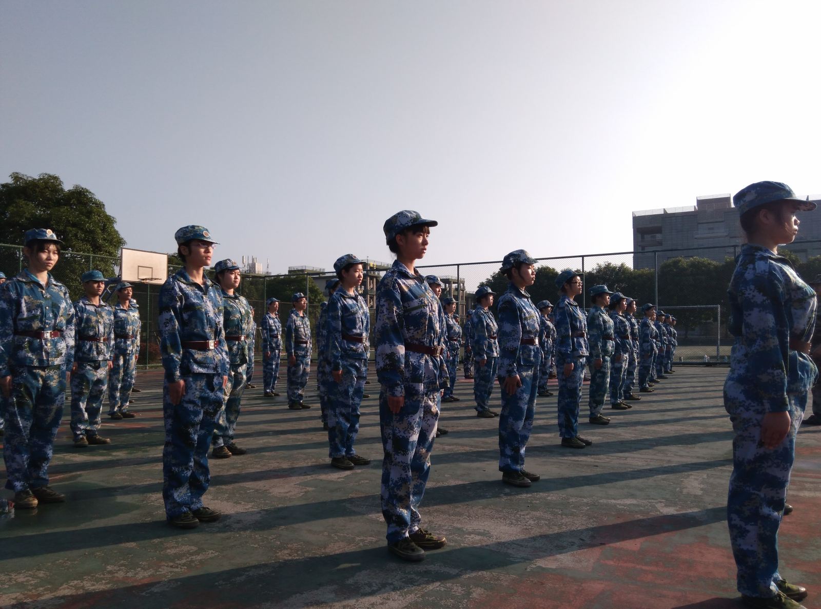 黄绿蓝相交融的迷彩服,朴素而庄严。多少大学生穿着它昂首立足于训练场上,勾勒出一幅宏伟的人生画卷。在这一片迷彩色的海洋中,我们都是重复地训练一些简单的内科目,立正、稍息、向左转、向右转、踏步、齐步走、立定……这些平时看起来非常简单的动作,但现在做起来并不容易,几天下来,几乎每个人都浑身酸痛,疲惫不堪。在坚持中,慢慢的自己和战友变得步伐一致、排面整齐,举手投足间都带着军人的风范,成就感也就油然而生。