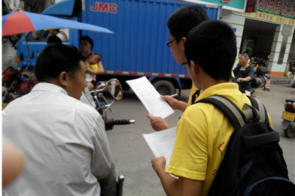 “生活满意度”调研课题。为更加深入了解当地居民的生活情况,我们来到钟一村以分组形式进行调研。调研的对象十分广泛,有杂货店老板、理发店员工、修车师傅、暑期工、失业青年等等,看着他们一边填写问卷,一边向我们倾诉他们的生活经历,有快乐、有平和、有无奈、有失望,才知道生活并不容易。顶着烈日在钟村中穿梭的他们,挥汗如雨,在大街小巷留下了忙碌而认真的身影。