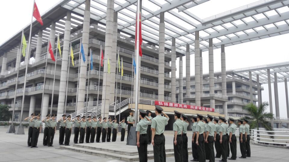 师生在学校正门广场举行升国旗仪式。学生处心理中心黄艳萍副主任,学院党委苏兆祥副书记,辅导员张明老师和2014级新生参加了升旗仪式。
