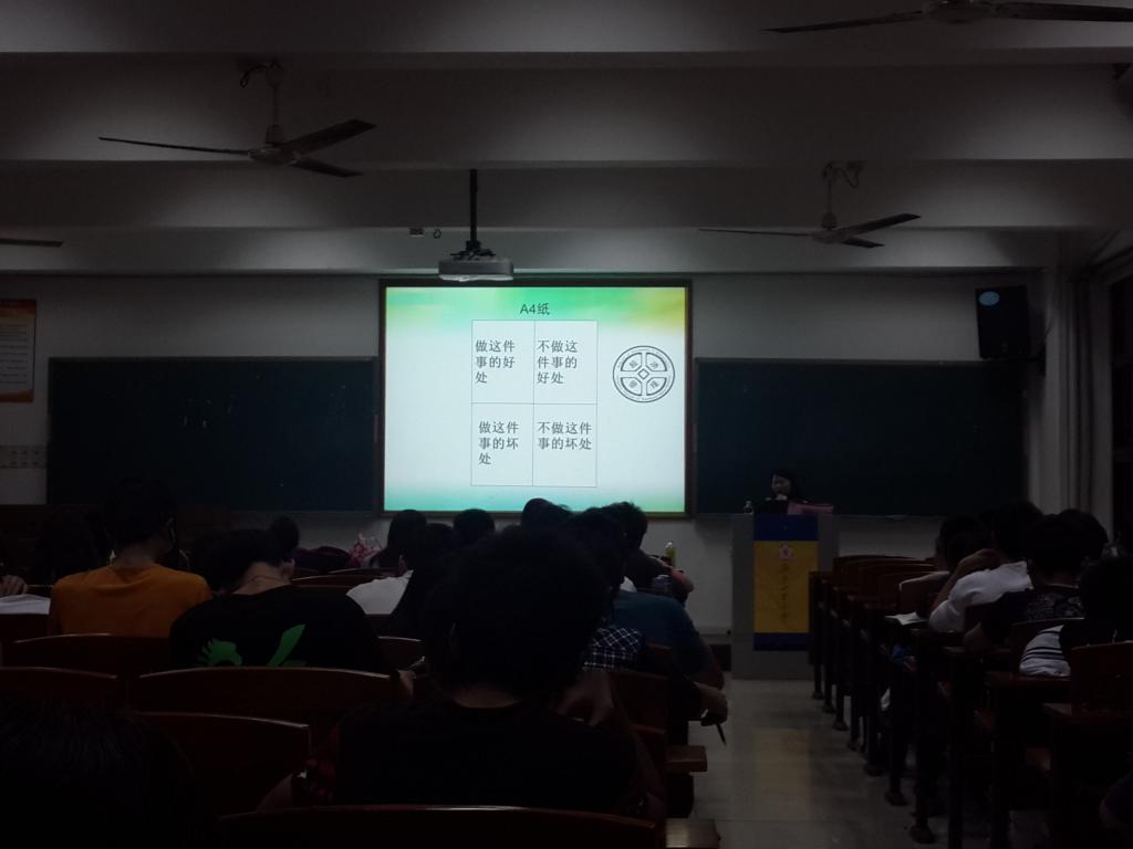 此次培训以“大学生常见问题”为主题,叶老师首先讲解了新生适应性问题、学业与社团活动的平衡、人际关系处理等常见问题,分析了产生此类问题的原因以及如何解决不同的问题,随后通过比较合理信念和不合理信念的特征,阐述了大学生心理健康的重要性。培训之余,叶老师带领同学们做了一次意象放松,使同学们的心理做了一次SPA,最后在一片热烈的掌声中结束了本次培训。