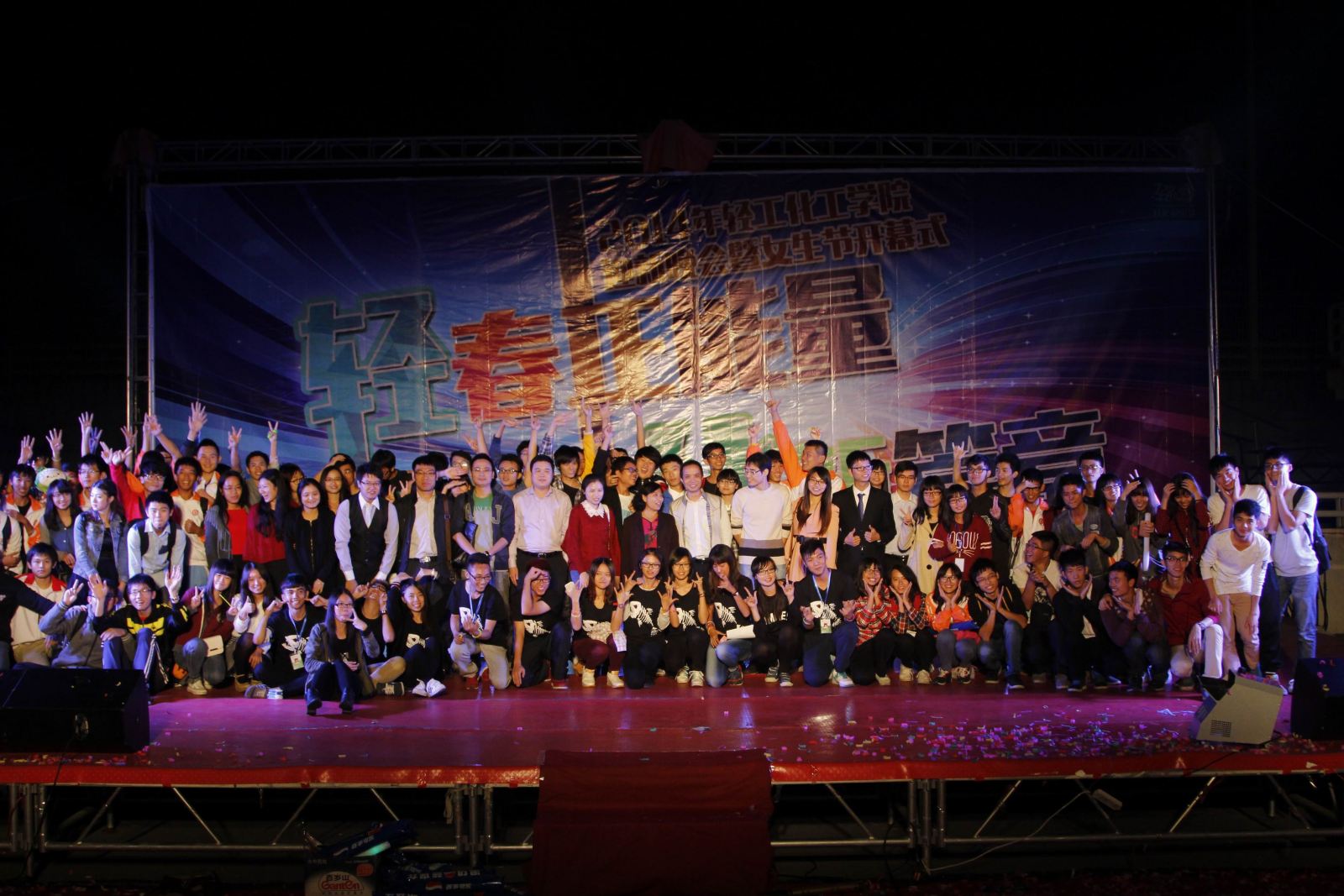 在这里隆重举办『轻』春正能量,共『化』新篇章——2014年迎新晚会暨女生节开幕式,学院党委副书记英健文、兄弟学院团学及社团指导老师刘南洲、王冠尧、颜倩、谢耀雯、陆玥、黄子桓、刘志平、刁衍斌,新生班主任成晓玲,学院校友代表李燊、谢礼旺、林延超、曹蒋华,学院全体辅导员,学校各级团学组织代表应邀出席本次晚会。