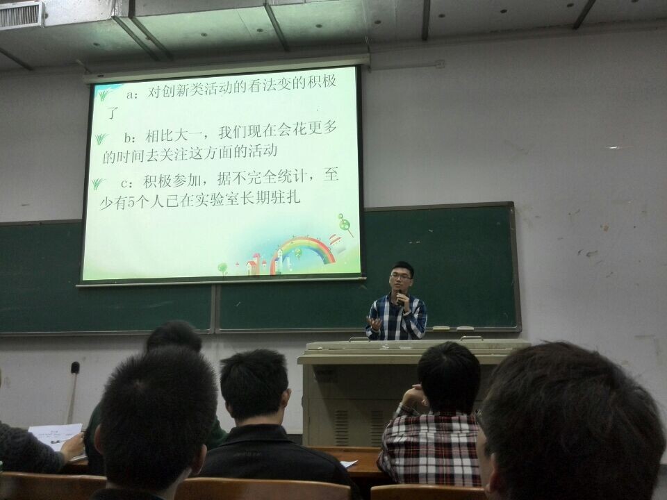 主讲环节,班委代表13级化工2班劳宇轩、13制药2班黄升、13食品2班蔡晓瑾先后围绕主题做了分享发言,代表班委介绍了各自班级的班风建设现状与班风规划展望。劳宇轩强调了制度建设在班风建设和规划中的重要作用;黄升以“让优秀成为习惯”为题,指出班级文化建设和班级共同价值观的形成是治理好班级的重要环节,并以自己创作的一首感人的诗表达对班级的热爱;蔡晓瑾用诙谐的语言介绍了班级在引领学风建设方面的激励措施。