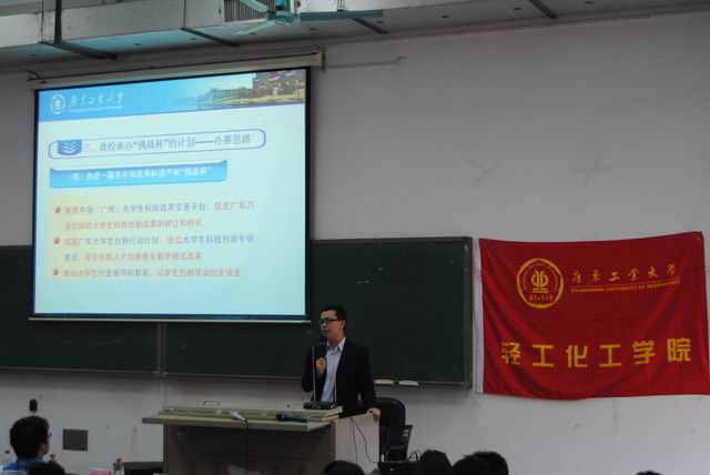 为更好引导同学们参与2015年在我校举办的第十四届“挑战杯”全国大学生课外学术科技作品竞赛,学校团委许泽浩副书记为同学们带来题为《以奋斗致青春,以挑战创未来》的精彩讲座。他结合我校申办“挑战杯”的历程,向同学们全面的解读我校承办“挑战杯”的初衷、办赛思路和相关的筹备工作,希望同学们都能够投入“挑战杯”竞赛和赛事服务工作中,去锻炼自我,不断成长。