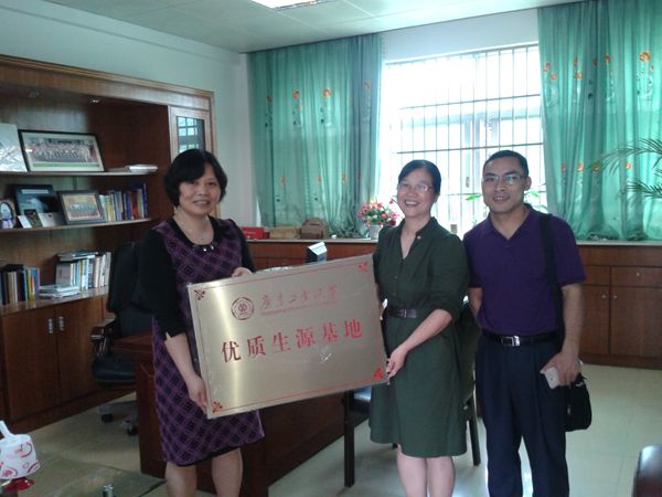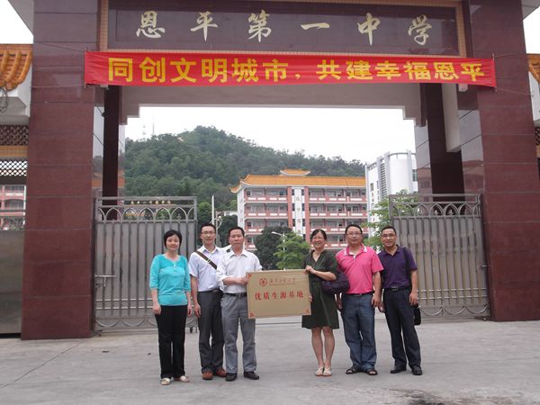 派出了由学院党委副书记英健文、制药系党支部书记郑杰、副教授谭伟组成的宣传工作组奔赴江门各中学开展招生宣传活动。宣传组先是驱车200多公里来到著名侨乡开平,然后又转战恩平,最后到达江门市区,马不停蹄地先后与开平市第一中学、开平市开侨中学、开平市长师中学、恩平市第一中学、江门市第一中学共5所中学签订了优质生源基地协议并一一进行了挂牌,宣传组分别向各重点中学的校领导、教导主任、高三级长详细介绍了今年我校获得批准整体进入一本招生的喜讯和75个专业在广东省内共招收10000名新生的计划,各中学对我校整体进入一本招生感到非常振奋,双方为今后的更广泛的联系合作创造双赢格局表示信心十足。