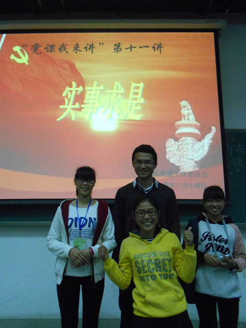 学生党建工作委员会举办的“党课我来讲”第十一讲,于3月14日晚在教四-204如期举行。来自11级制药专业第一党支部的揭志达同学和萧韵杰同学担任主讲嘉宾,学生党建指导老师魏源出席了本次讲堂,12级、13级共计200多名学生参加。