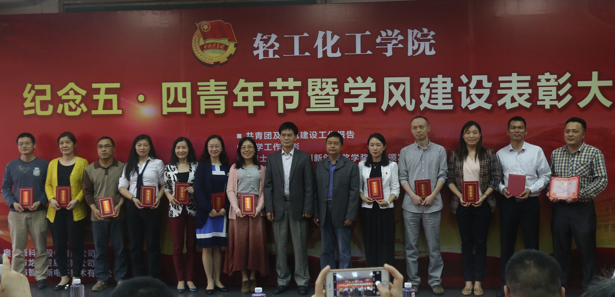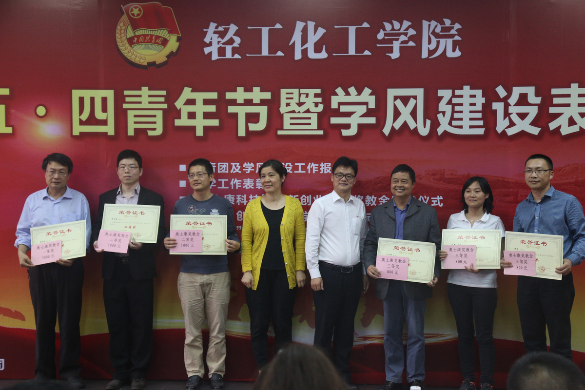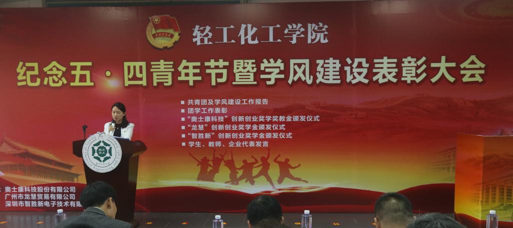 教师代表,奥士康公司王国安经理、龙慧公司符劲总经理、智胜新公司余克壮总经理共同为获得表彰的优秀团支部等16项荣誉、3项企业创新创业奖学金的领奖代表颁发了奖状或证书。学院领导给三家企业的代表赠送了锦旗,感谢企业热心支持育人工作。