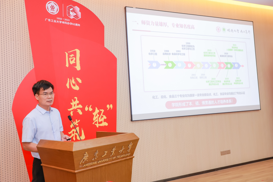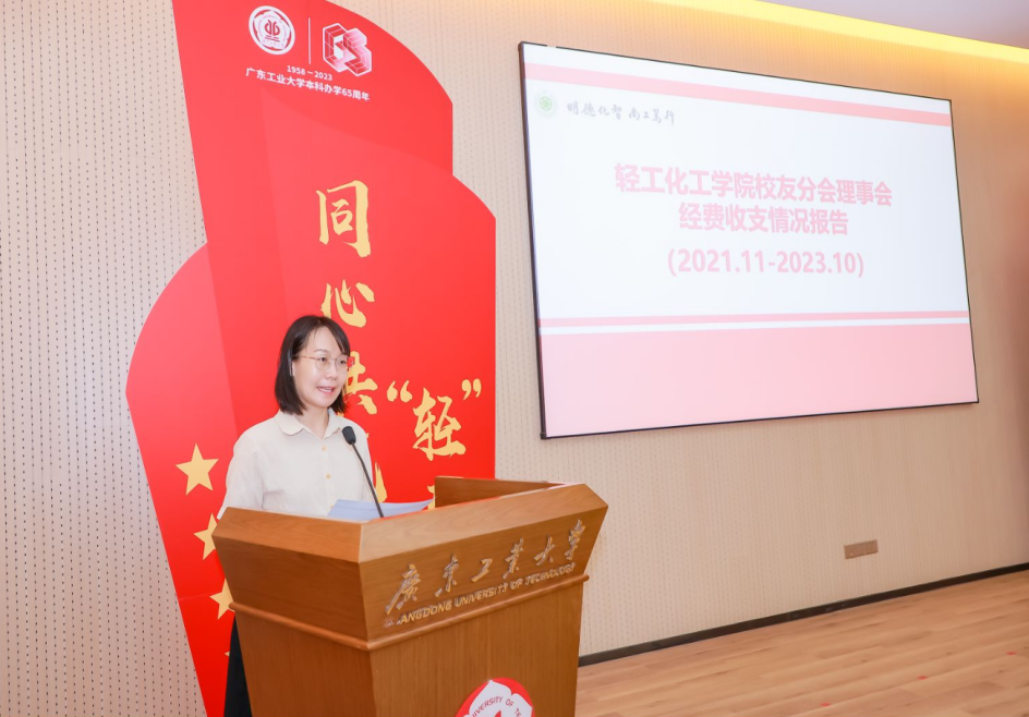 执行会长黎庆恺校友作履职发言。他对学院校友分会的厚爱和理事们的信任表示感谢,表示今后将团结带领校友们秉承服务母校、母院发展,服务广大校友的宗旨,努力做好各项工作,为母校的建设献计出力,持续推动校友分会以不同方式和途径反哺母校、母院发展。他倡议各位校友在学校本科办学65周年之际,充分发挥自身优势,为母校、母院的发展献智出力,讲好轻化故事,宣扬广工精神。
