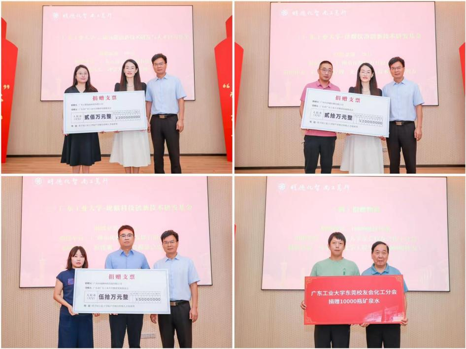 会上,广东云韬氢能科技有限公司、广州市珑麒科技发展有限公司、广州市泽耀仪器有限公司分别向学院进行了捐赠,捐赠款项用于学院产学研合作和人才培养等。学校东莞校友会化工分会向学院捐赠了10000瓶饮用水,用于庆祝学校本科办学65周年主题系列活动。